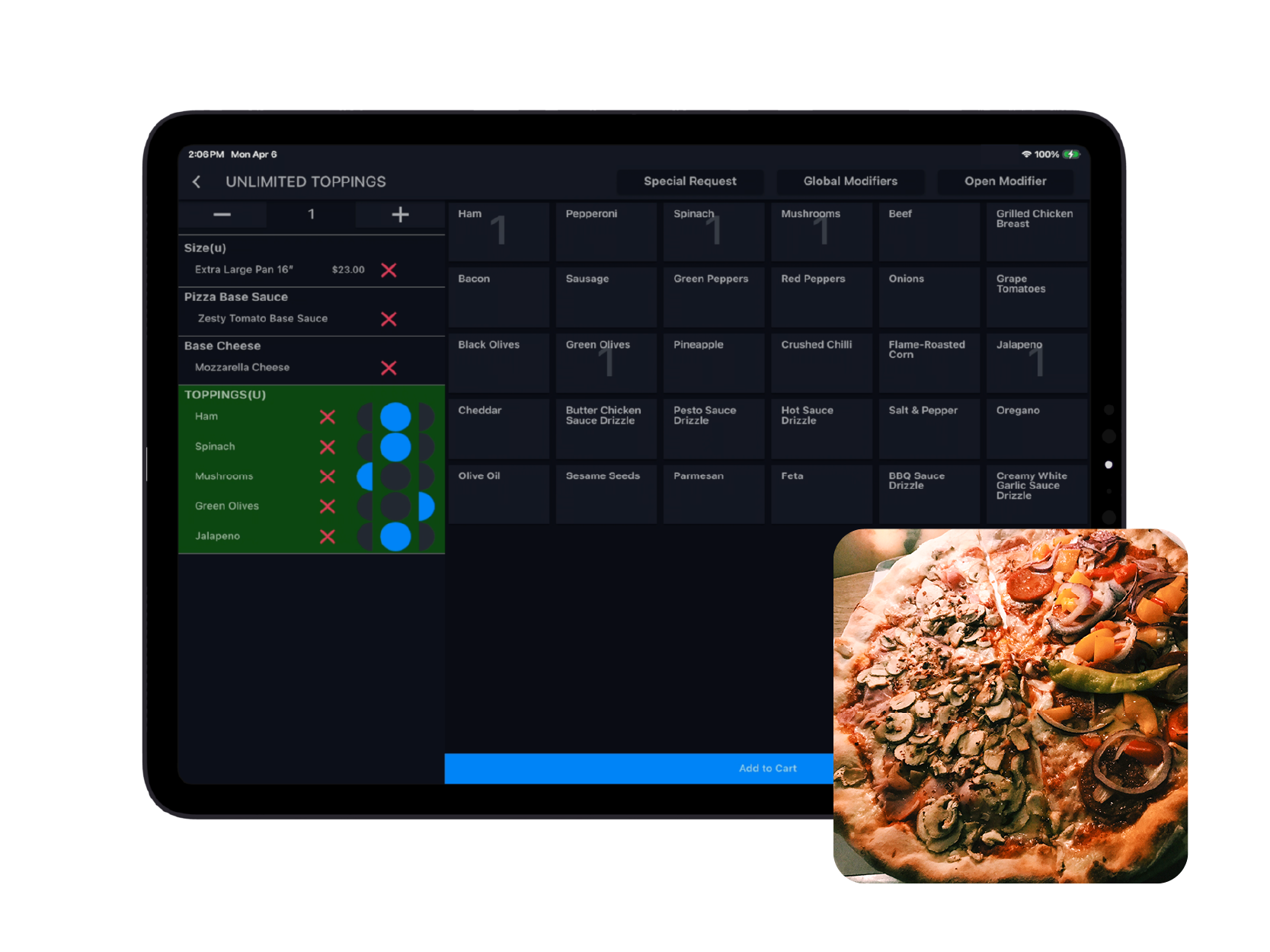 Snappy POS is optimized for pizza workflows, from half-and-half toppings to delivery management.